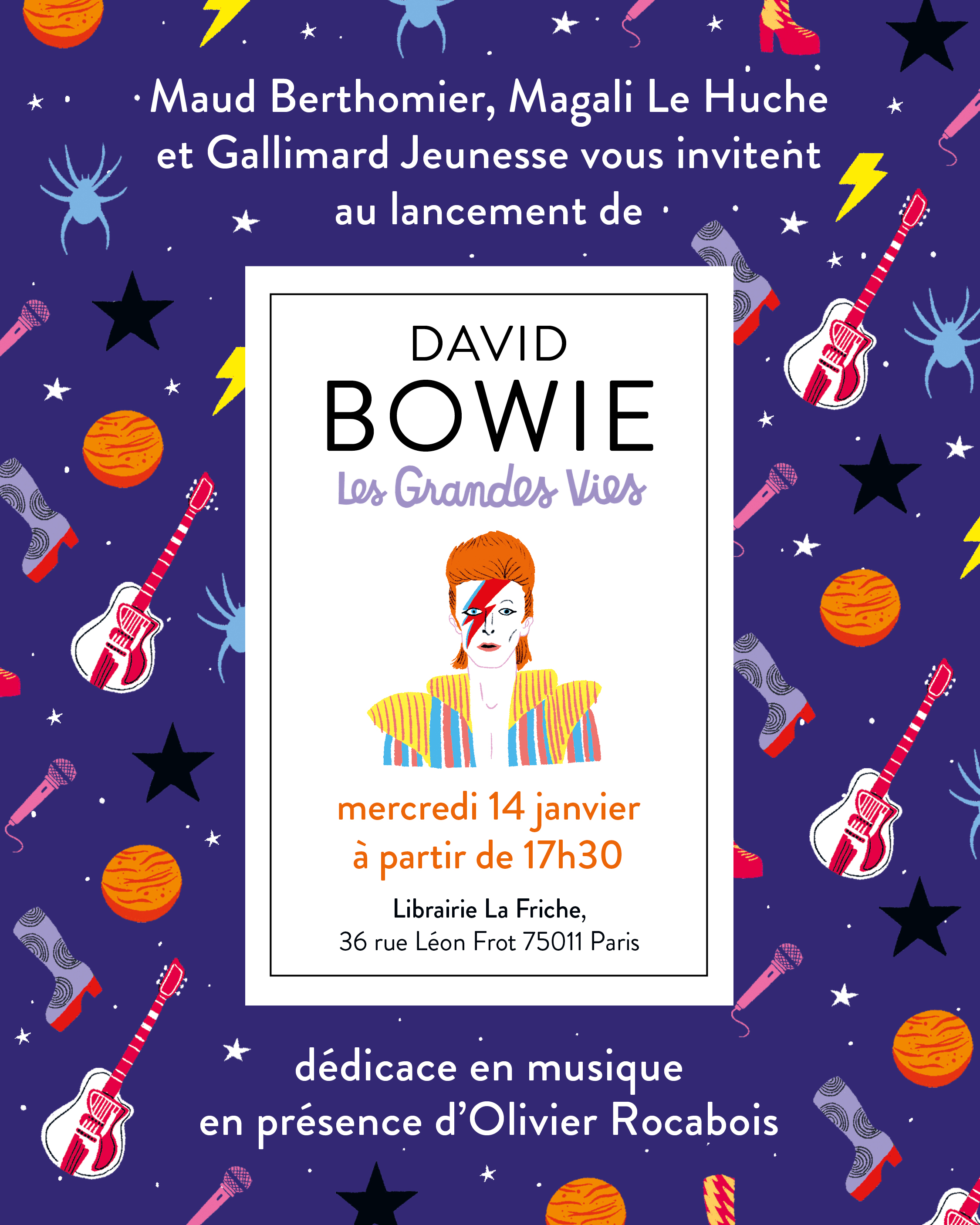 Le mercredi 14 janvier 2026, Maud Berthomier, Magalie Le Huche et Gallimard Jeunesse vous invitent à célébrer la mémoire de David Bowie en musique, en présence d’Olivier Rocabois ! Fans de la première heure et enfants de fans, complices comme néophytes, bienvenu.es !